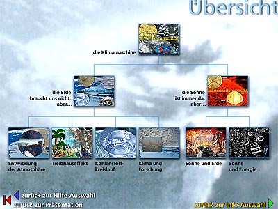 Mit Bildcollagen, Grafiken, Karikaturen, Videos und 3D-Animationen haben wir diese Themenkreise dargestellt. Es werden Analogien zum täglichen Leben hergestellt (z.B. Bahnfahren) und Beispiele illustriert (z.B. El Niño).