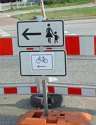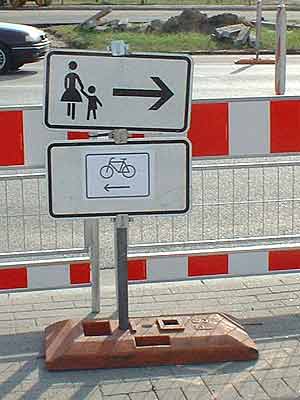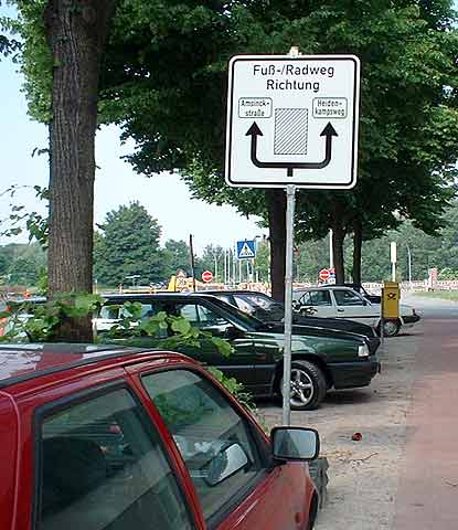 Als unvorbereiteter Verkehrsteilnehmer nähern wir uns einer Kreuzung. Nun ist gerade diese Kreuzung zugegebenermaßen ein komplexes Gebilde - vielleicht möchte man den werten Bürger nicht mit der realistischen Darstellung verwirren und wählte deshalb die Form der "Black Box", um welche man Fußgänger und Radfahrer mit Hilfe der Schilder herumleiten will:
